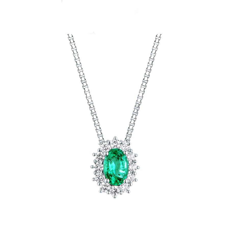 Mirco Visconti, Collana in Oro Bianco 18ct - 750°°° 3,30 gr, Smeraldo Taglio Ovale 0,54 ct, Provenienza Zambia, Diamanti Taglio Brillante 0,21 ct G/VS